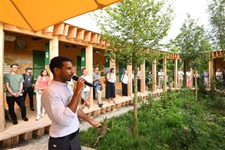 Im Anschluss erläuterte Tobias Fürst von der GKR Hydro GmbH innovative und gleichzeitig funktionelle Konzepte für die nachhaltige Begrünung von Büro- und Produktionsgebäuden vor und sprach damit ein Thema an, das in einer nachhaltigen Zukunft eine immer größere Rolle spielen wird. Denn Fassadenbegrünung und die Arbeit mit Pflanzen zur Verschattung und Verbesserung der klimatischen Bedingungen moderner Gebäude ist längst keine Idee visionärer Architekten mehr. Das kann man auch unschwer an der Architektur des hölzernen Pavillons des Landkreises München erkennen, der um einen zentralen begrünten Innenhof herum angelegt ist.